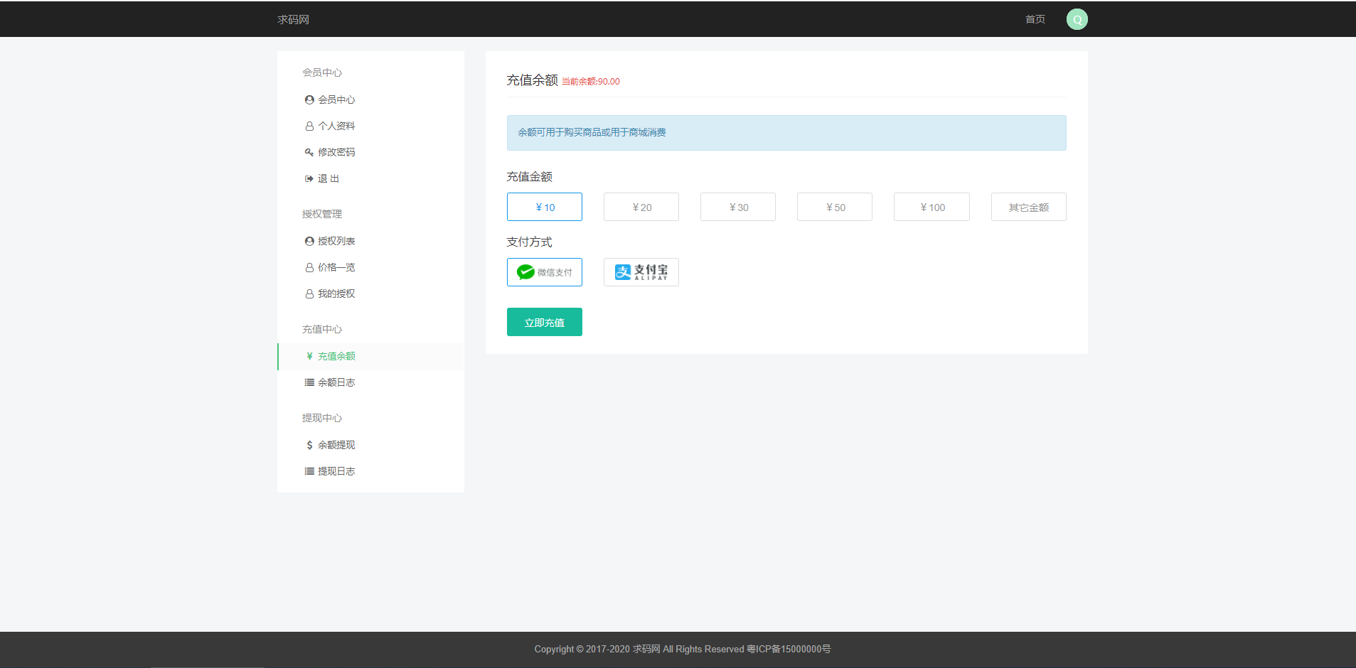 支持前台在线充值支付购买